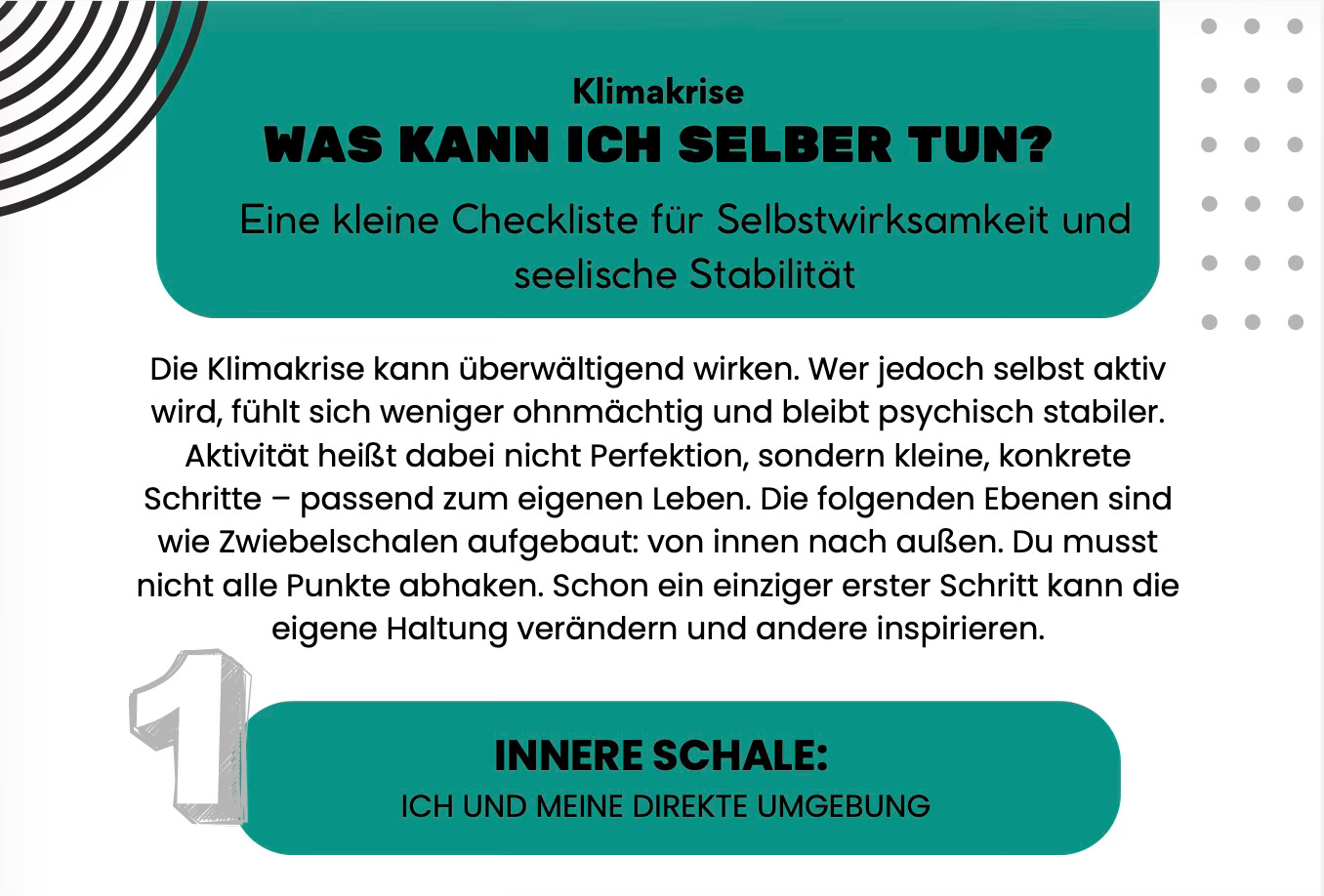 In meiner Checkliste für Selbstwirksamkeit mit dem Titel “Was kann ich selber tun?” (siehe unten) nenne ich es die Zwiebelschalen: von der inneren Haltung, über den Alltag bis zum gemeinsamen politischen Handeln. Es wird wohl bis auf Weiteres nicht einfacher. Die Rückschläge kommen offenbar immer wieder. Aber wir machen weiter. Trotzdem. Hoffnung ist ein gemeinsamer Prozess. Und los geht’s…