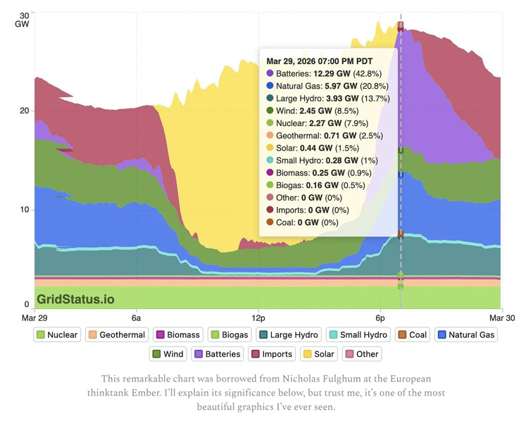 But now look at the purple blob to its right—that’s battery storage coming online as the sun goes down. Those batteries spent the afternoon soaking up sunshine—cheap cheap sunshine—and now they’re distributing it back to the grid. As Californians get home from work, turn on lights, cook dinner, start charging their EVs, and run their frozen margarita machines (I may have an idealized idea of California life), batteries are providing most of the power, outstripping imported power (much of which is renewable too), natural gas, and other sources like nuclear.“